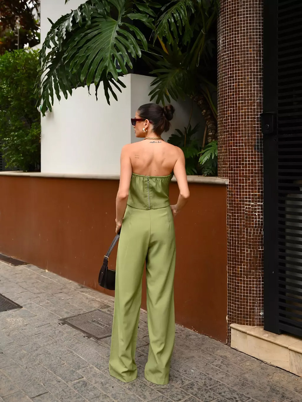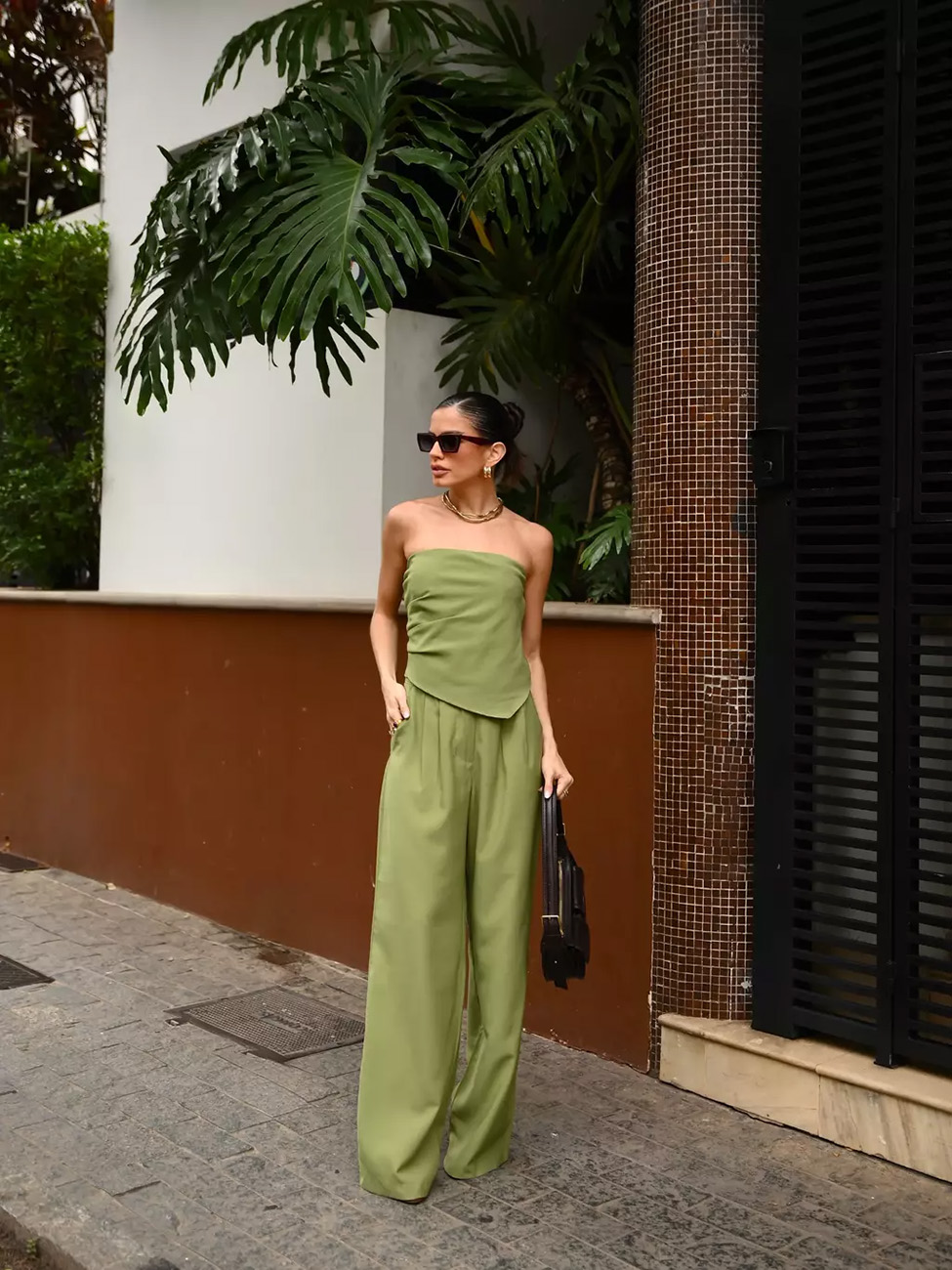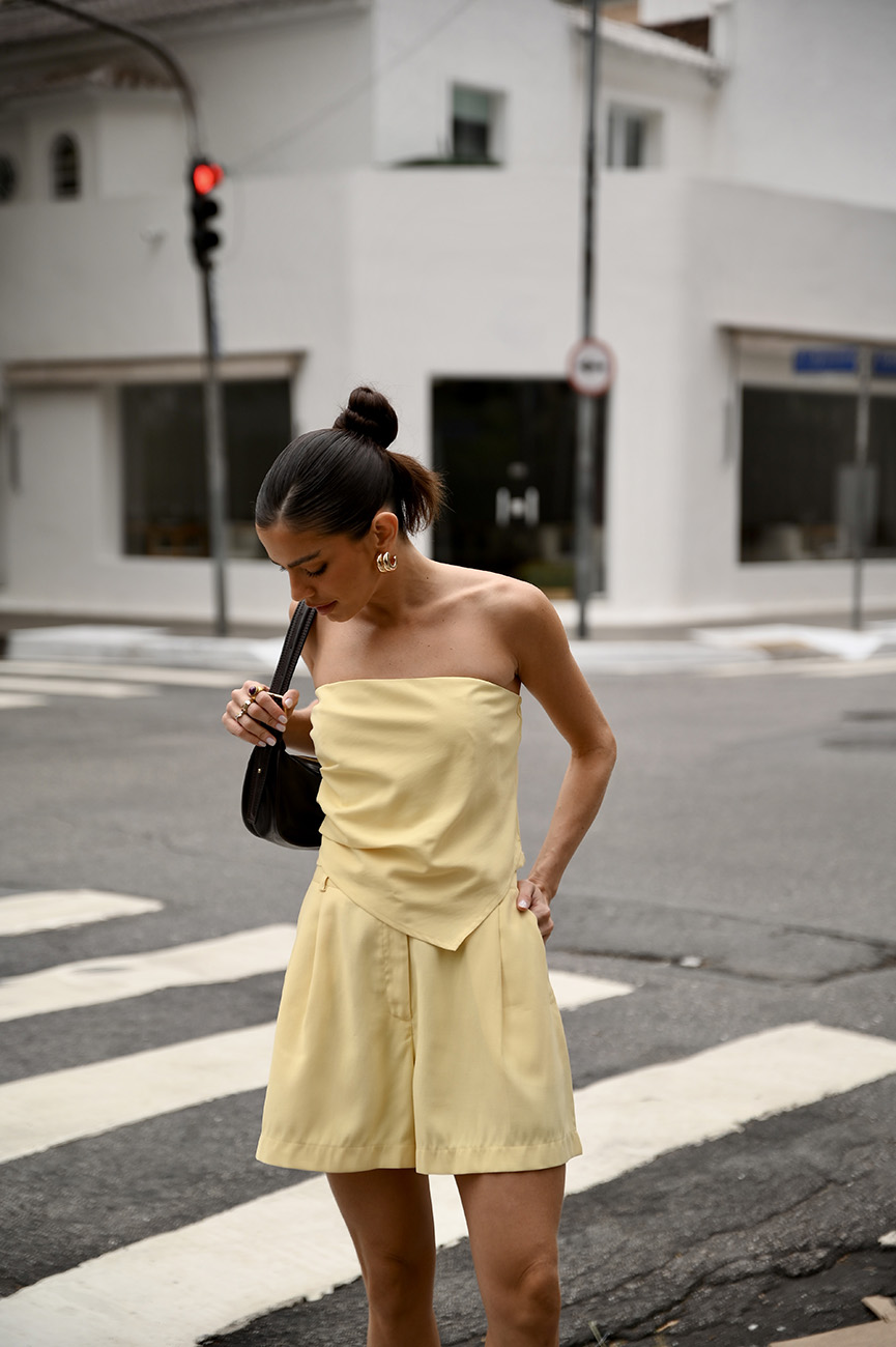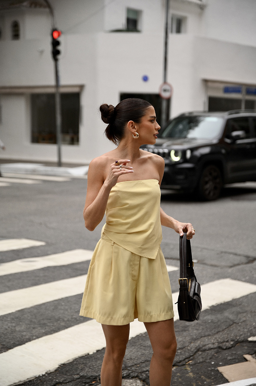 Top feminino confeccionado em alfaiataria de base viscose, oferecendo estrutura, toque macio e excelente caimento. O modelo tomara que caia valoriza o colo de forma elegante, enquanto o recorte assimétrico adiciona um visual moderno e diferenciado à peça.