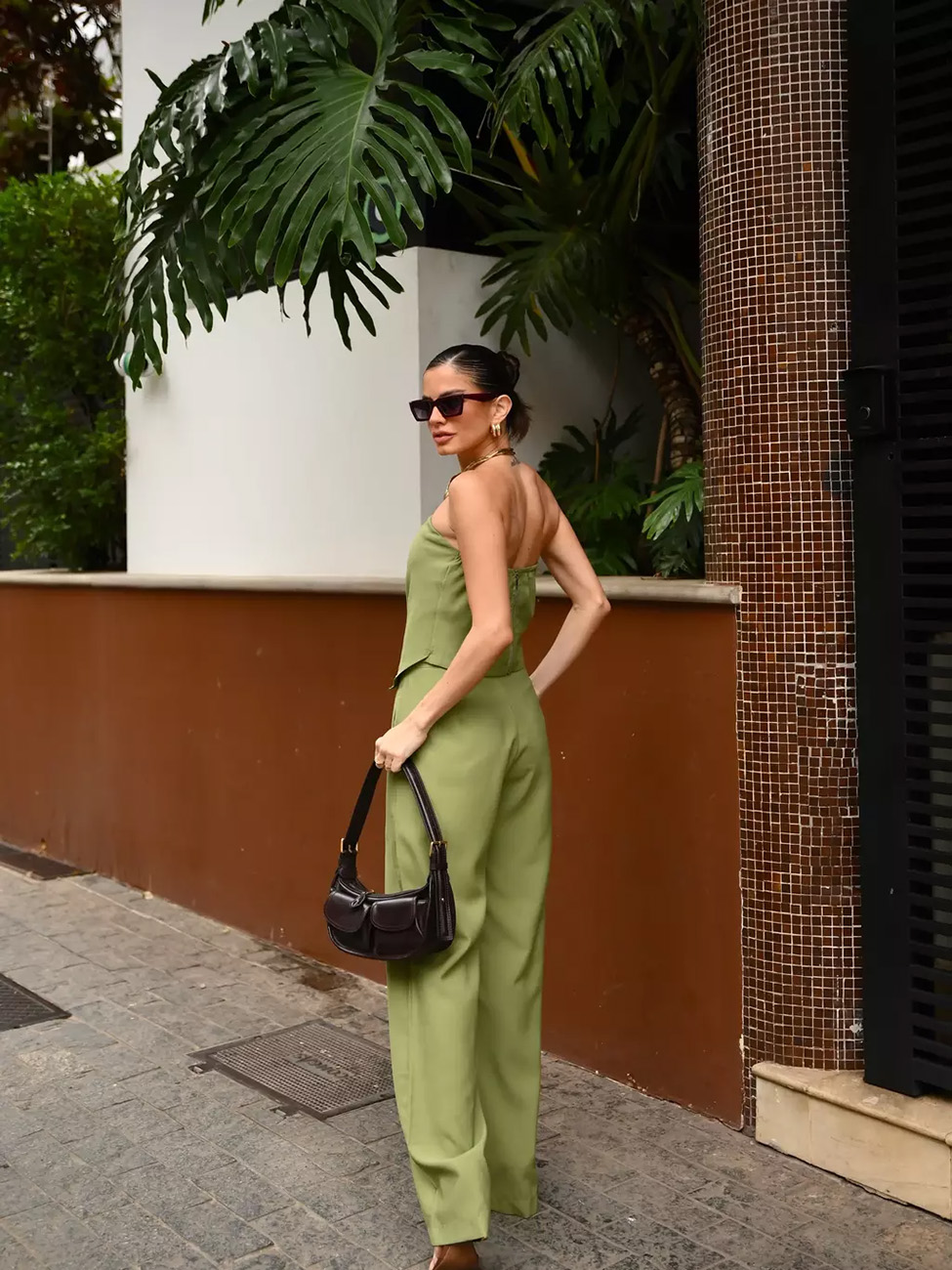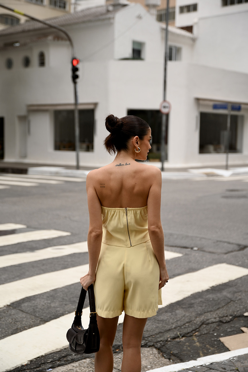 O fechamento em zíper de metal destacável nas costas garante praticidade e acabamento sofisticado, além de facilitar o vestir. Com modelagem estruturada, é ideal para composições que transitam entre o casual chic e produções mais elegantes.